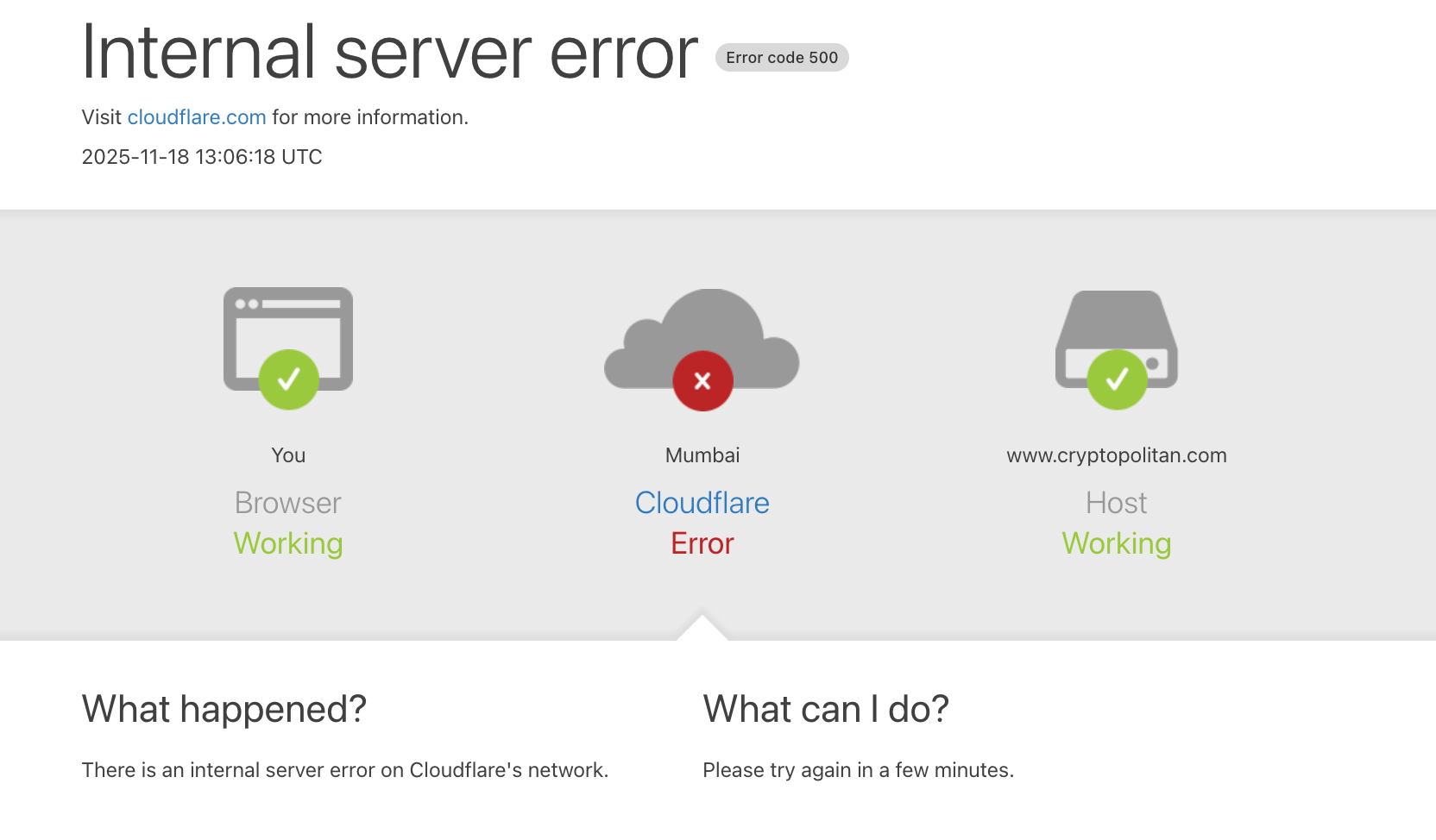 Cloudflare said it was dealing with “widespread 500 errors” across multiple customers, with recovery underway but elevated errors still possible.