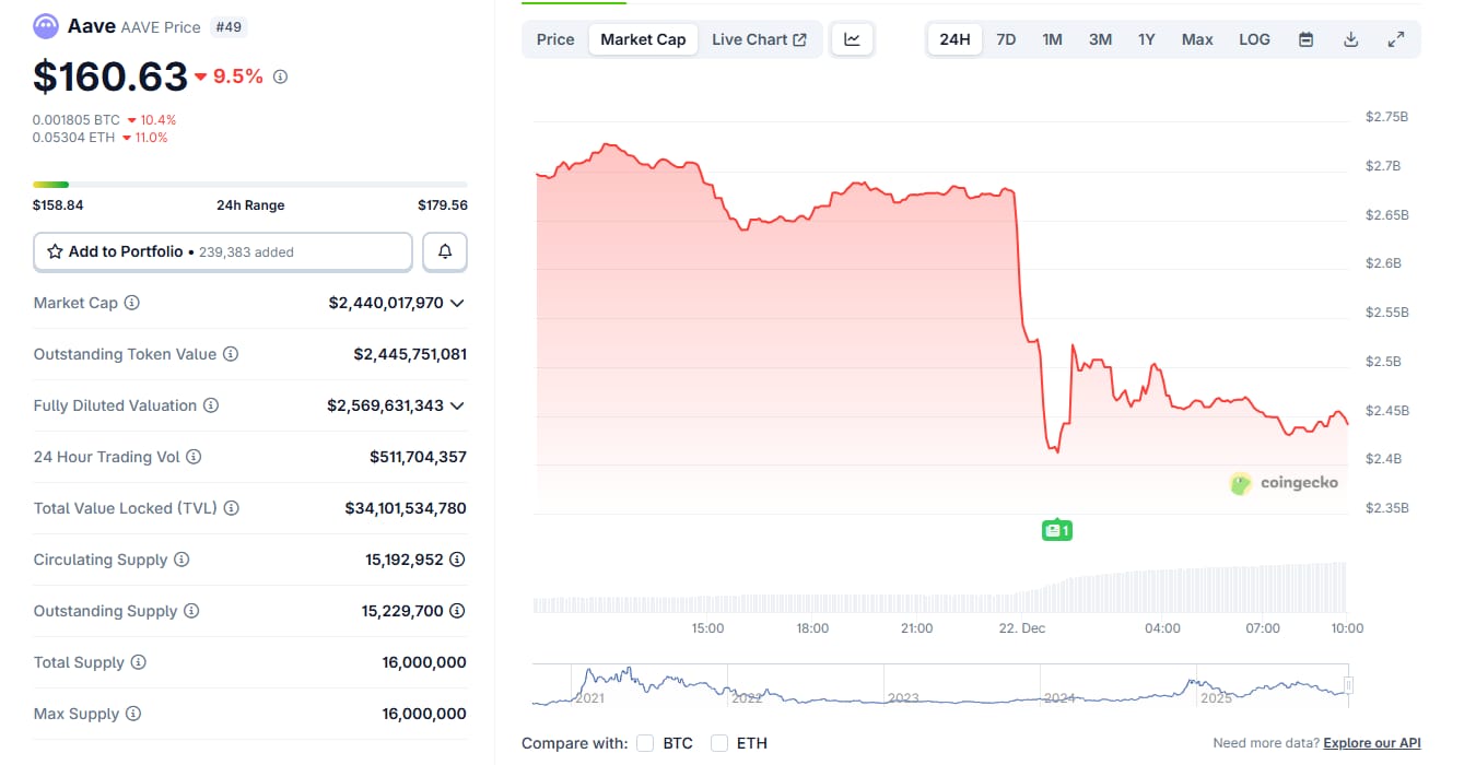Theâdrop in the tokenâs value indicates that investors have fears about rushed governance changes especially in a market still dealing with low volumes and end-of-year exhaustion. Aave is still a DeFi behemoth with $33Bâin TVL and collecting $726M in fees annually, but this price action illustrates that not even the top-tier protocols are immune from bad optics around governance.