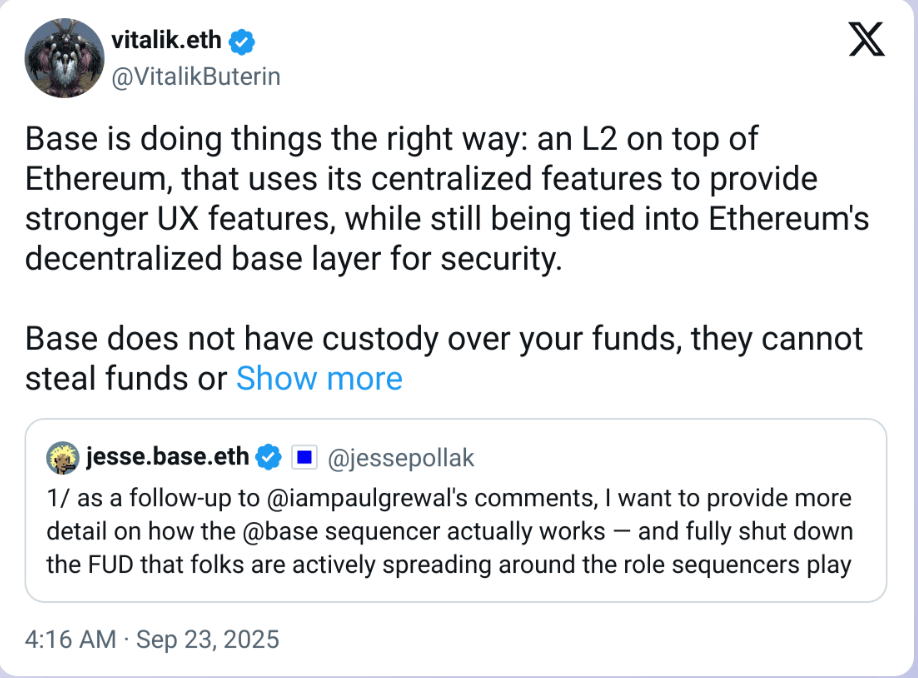 Vitalik Buterin, defended Coinbasesā Base, arguing that it still counts as a āreal Layer-2ā as even after the shutdown, withdrawals to Ethereum remain open.