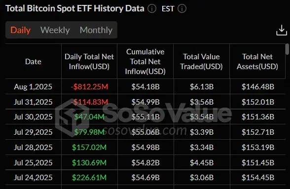 With markets in flux, Bitcoin ETFs bled over $800 million on August 1 alone, the worst single-day outflow since launch.